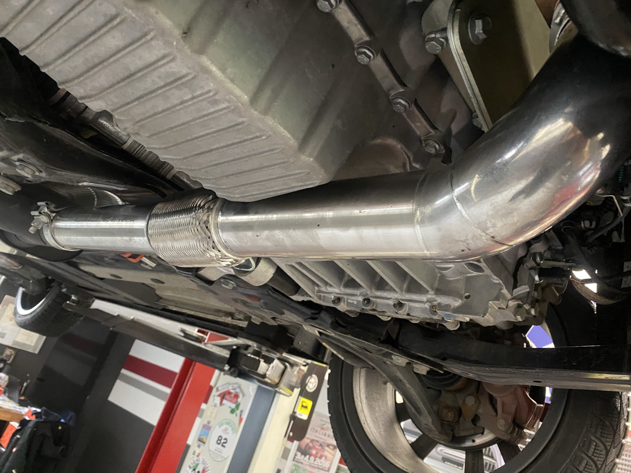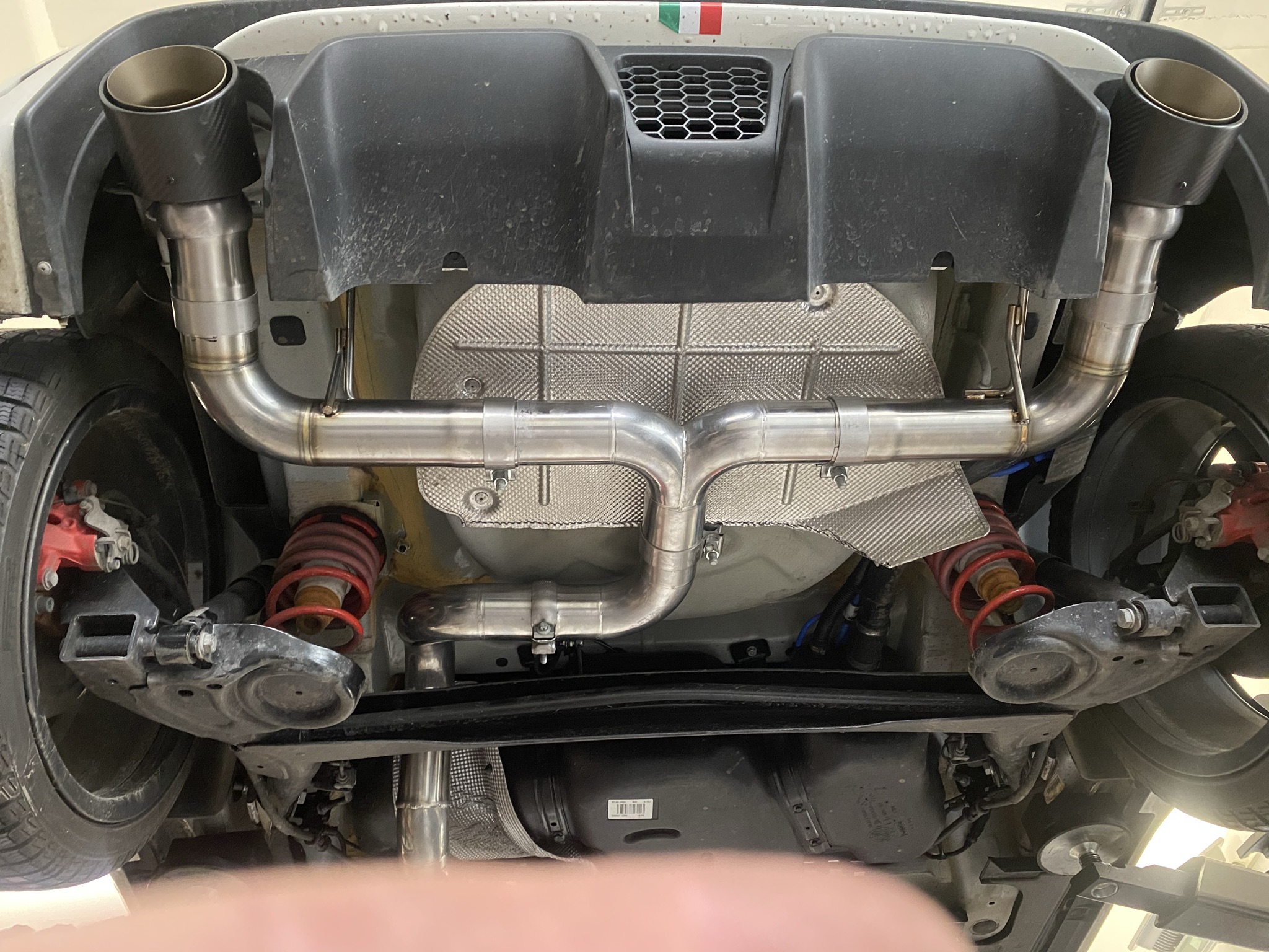 Heute kam Micha mit seinem 3 Monate alten Abarth 500 Turismo für den Einbau einer klappengesteuerten G-Tech Auspuffanlage zum Alfadoktor. Hier wurde die komplette Anlage getauscht (ab KAT). Die Verarbeitung und die Passgenauigkeit der gelieferten Anlage ist sehr gut. Die Anlage hat natürlich ein EWG Zertifikat und muss nicht in die Fahrzeugpapiere eingetragen werden. Der Sound ist bei geschlossener Klappe schön tief, ohne zu dröhnen. Ab 4000 UPM, wenn die Klapppe sich öffnet, ist es Musik in den Ohren. Für mich ist es eine alltagstaugliche Anlage und für längere Autobahn-Fahrten absolut geeignet.